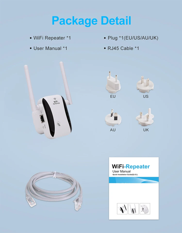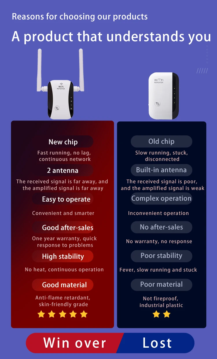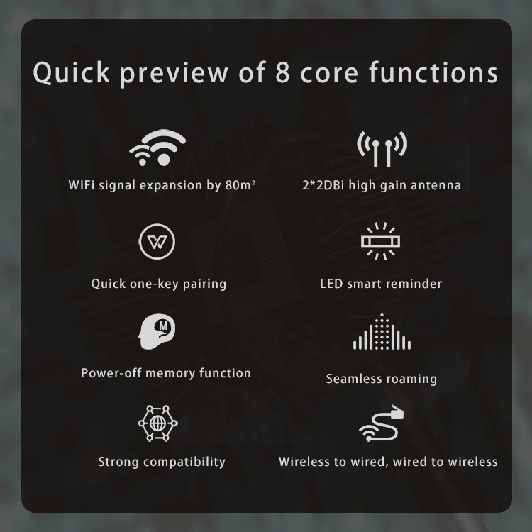 Solution: MediaTek MTK,2 external high-gain antennas, new chip, smooth and non-stuttering, simple operation and setting, more stable signal transmission, support for simultaneous connection of up to 32 devices, support for wireless to wireless, wired to wireless, and wireless to wired . Speed: 300Mbps, covering an area of about 180 square meters.
