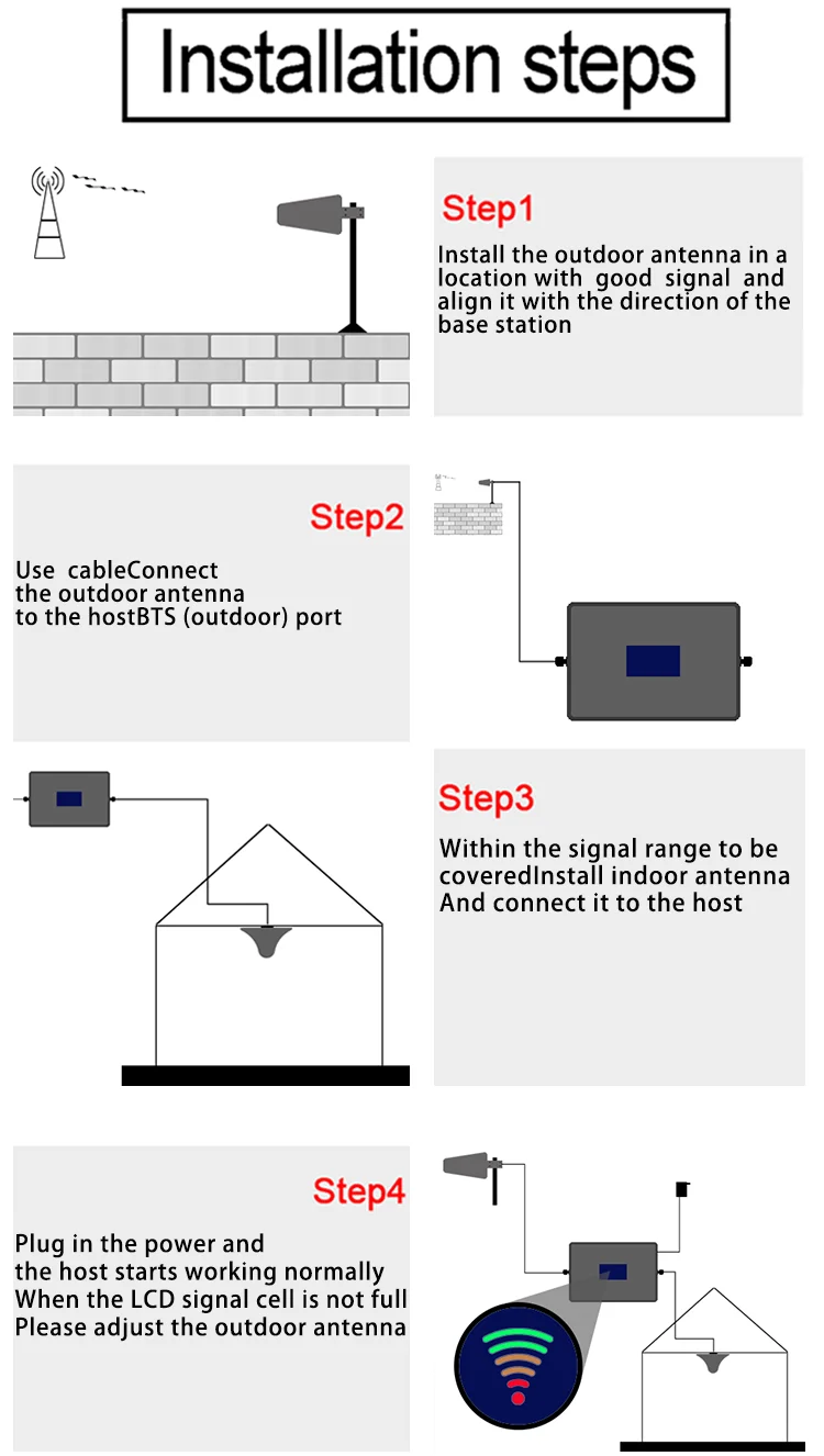 (1).Please confim that the operator base station frequency band of your SlM card is suitable for the effectiverequency of this device (2).Make sure you get a good signal outside your house that you want to amplify.3-5 bar signal can be displayed onyour phone (at least -70dB-90dB is captured).Otherwise. the signal amplifier will not improve your signal